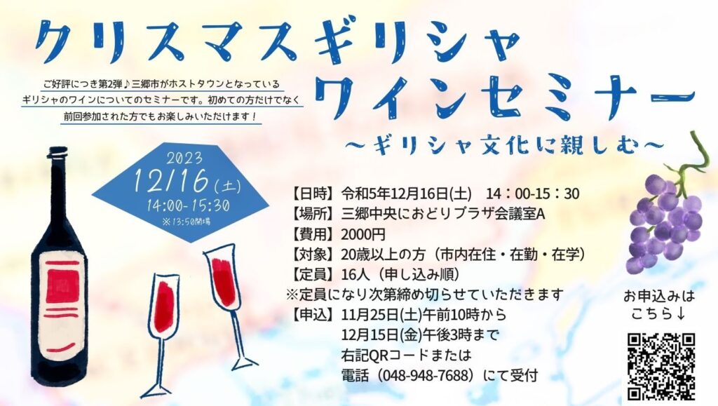 三郷市とギリシャのホストタウン交流についてご紹介し、ギリシャワインや食文化について楽しく解説します。